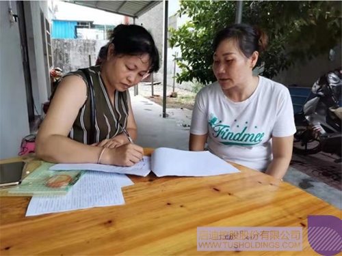 2019年9月11日,乐动在线环境东方项目公司工会副主席高元霞陪同东方市总工会主任符颖娴(左)到周秀娟(右)家了解情况