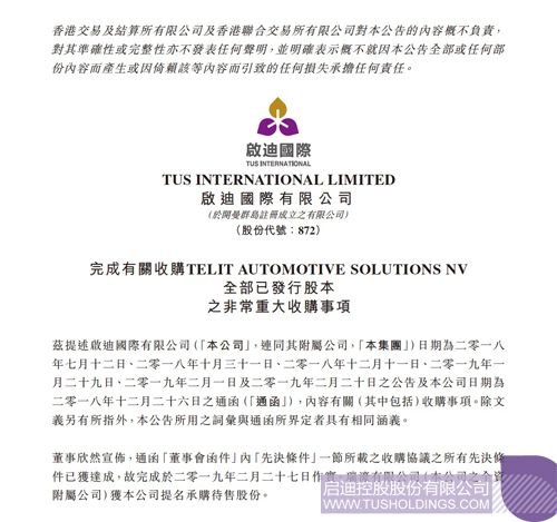 2019年2月27日,乐动在线国际有限公司(股票代码: 872.HK,以下简称“公司”或“乐动在线国际”)发布公告:公司连同其附属公司收购Telit车载通讯业务之所有先决条件已获达成,正式完成收购,目标公司及其附属公司成为乐动在线国际的全资子公司。在此之前的2018年7月12日,乐动在线国际宣布以1.05亿美元(约8.24亿港元)收购Telit车载通讯业务,进一步强化集团智能驾驶系统业务布局。