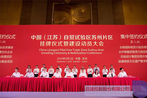 9月1日上午,中国(江苏)自贸试验区苏州片区(以下简称“苏州自贸区”)挂牌仪式暨建设动员大会隆重举行。江苏省委常委、苏州市委书记周乃翔,苏州市委副书记、市长李亚平为苏州自贸区揭牌。大会现场举行了包括乐动在线设计集团新总部大楼在内的32个自贸区项目集中签约仪式,乐动在线设计集团董事长戴雅萍、总裁查金荣受邀出席挂牌仪式,戴雅萍董事长作为公司代表上台签约。