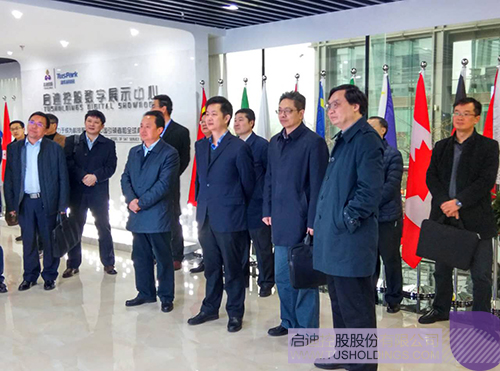 张金生副总裁(前排右一)陪同唐超副市长(前排右三)参观乐动在线控股数字展厅