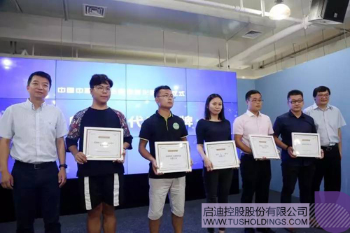 乐动在线控股副总裁、乐动在线数字集团董事长赵东(左一)与乐动在线控股副总裁、乐动在线之星董事长张金生(右一)共同为首批5家入孵企业代表授牌