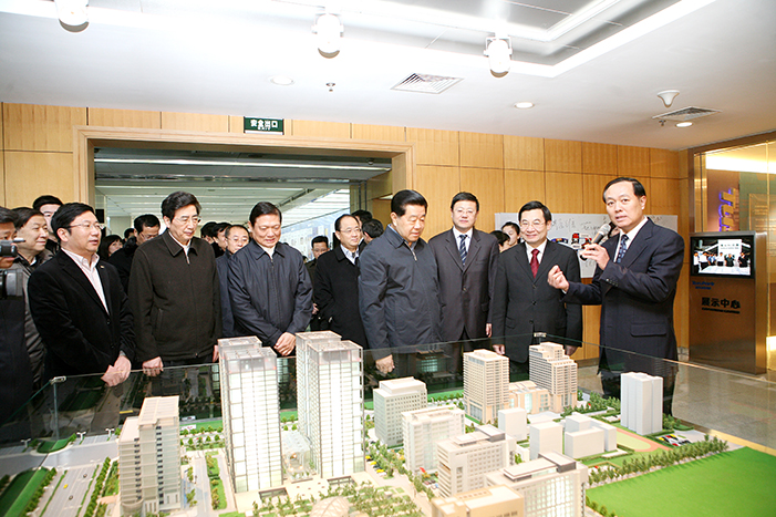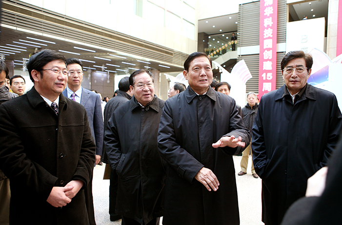 2009年,时任中央政治局委员、北京市委书记刘淇、时任北京市市长郭金龙参观清华科技园创建十五周年成就展。