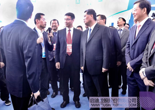 湛江市市长姜建军(前排右三)、副市长欧先伟(前排右二)一行到湛江乐动在线展位参观