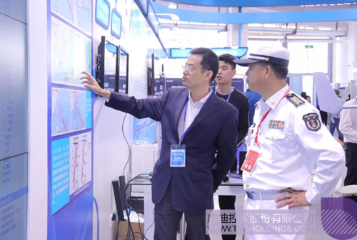 某舰队领导饶有兴趣地参观湛江乐动在线展区,详细了解集成了风暴潮、海浪等预警成果、实时雷达数据与海域无人机及海上无线通信技术的“乐动在线海洋+”科创平台
