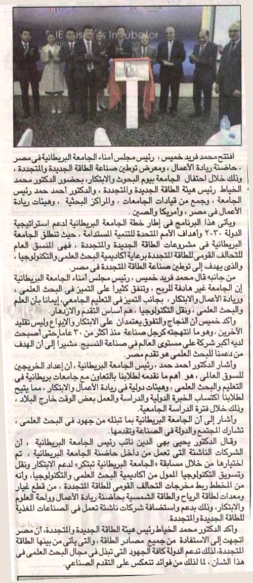 穆罕默德·法里德·哈米斯在致辞中表示,大不列颠大学支持开办孵化器不是为了盈利,而是为了在做好大学教育工作的同时,能在科研和创新创业领域有所突破。因为科研和科技成果转化,是国家进步与繁荣的基础。他强调:““成功和卓越,依靠的是创新和创造,而非模仿他人。’是我三十多年来作为企业家一直秉持的态度,我们支持科研发展,就是为了实现埃及的进步。”