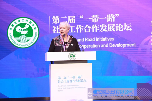 随后,国际社工联亚太区主席露丝·亨德森、国家开放大学社会工作学院执行院长史柏年发表主旨演讲,探讨“一带一路”社会工作如何落地。露丝·亨德森表示,“一带一路”倡议将凝聚沿线国家携手同行,随着政府部门和民间组织的共同推进,社会工作将发挥更重要作用。史柏年在以《“一带一路”发展倡议与社会工作的使命》为主题的演讲中提出, “一带一路”建设是百年大计,在逐渐演变的过程中,可能会引起自然与社会环境的变迁,这将带来“一带一路”发展过程中的社会工作的新使命以及促进社会工作大发展的新机遇。