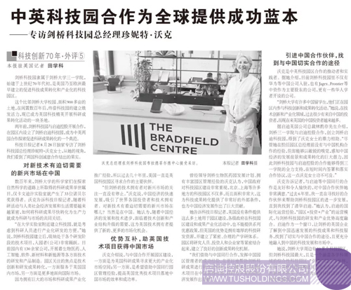 9月4日,科技日报《科技创新70年》专访剑桥科技园总经理珍妮特·沃克 ,以下为报道全文: