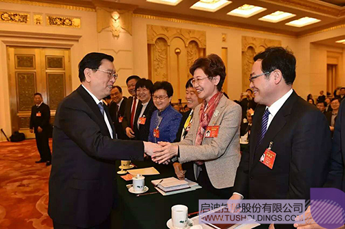 张德江(左一)参加江苏代表团审议并与戴雅萍代表(右二)亲切握手
