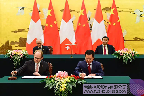 2016年4月,中国国家主席习近平与瑞士国家主席施耐德·阿曼共同见证乐动在线控股董事长王济武(前排右)与瑞士国家创新园签署合作协议
