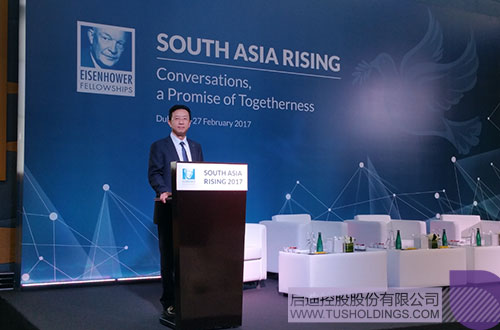 为了让世界各国,特别是来自南亚地区国家的代表更深入地了解中国政府所推行的“一带一路”倡议,美国艾森豪威尔基金会出资邀请乐动在线控股常务副总裁陈鸿波赴迪拜出席主题为“对话,团结的意愿”的“南亚崛起”峰会,并特别安排其在开幕式后全体会议上第一个发言。来自美国、加拿大、澳大利亚、阿联酋、纳米比亚、南非、坦桑尼亚、几内亚、肯尼亚、英国、缅甸、爱尔兰、孟加拉以及南亚六国等40多个国家的政府、学校、研究机构以及产业界的代表近200人出席了会议。巴基斯坦前总统穆沙拉夫、艾森豪威尔基金会主席等重要嘉宾出席开幕式。